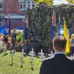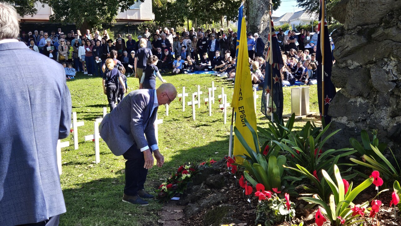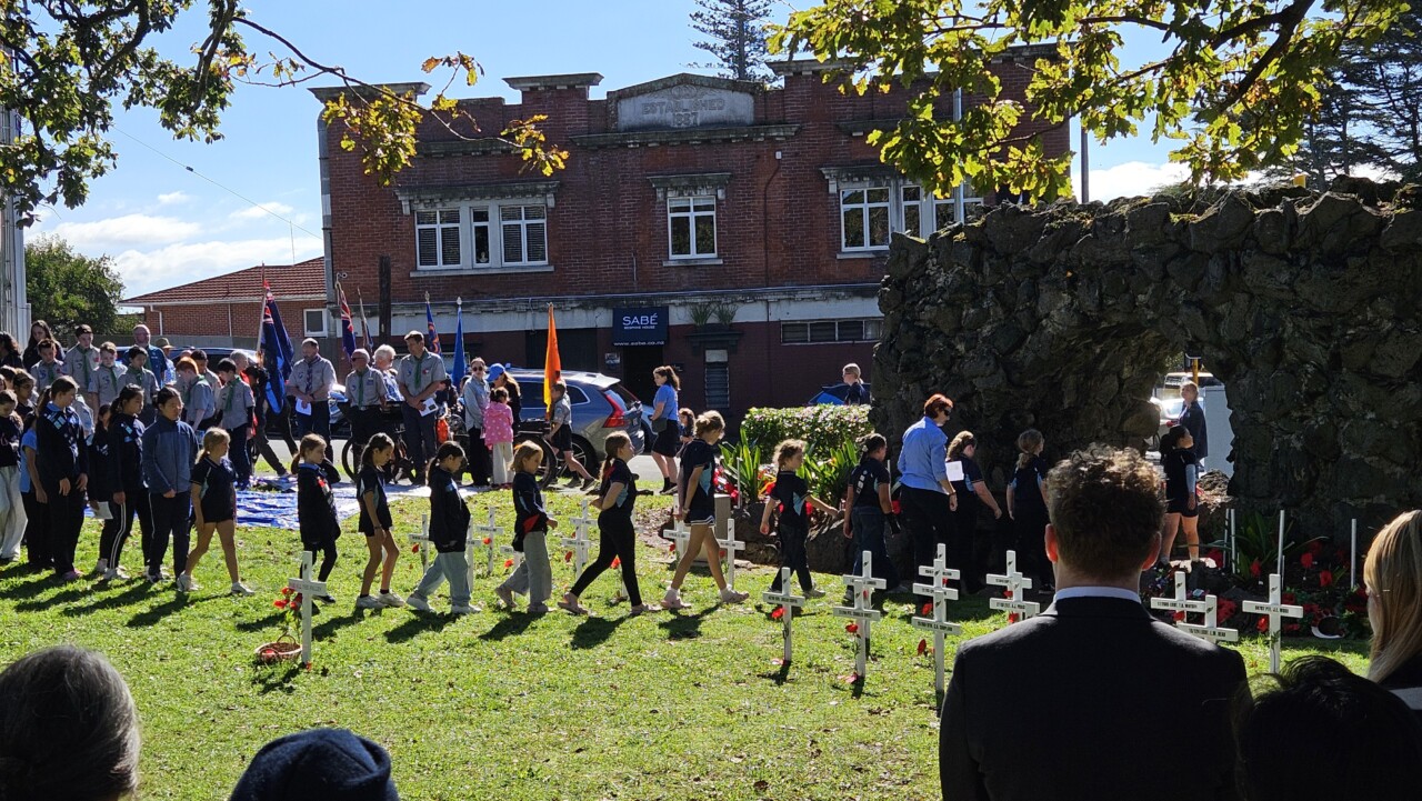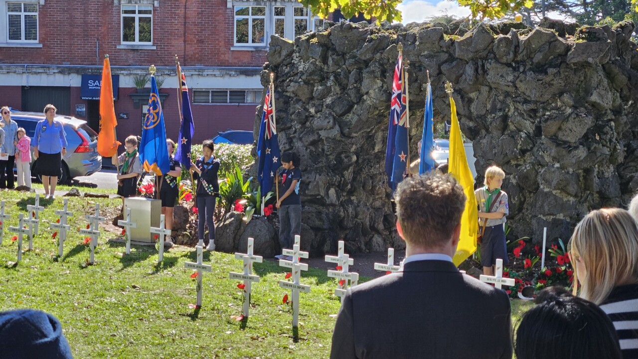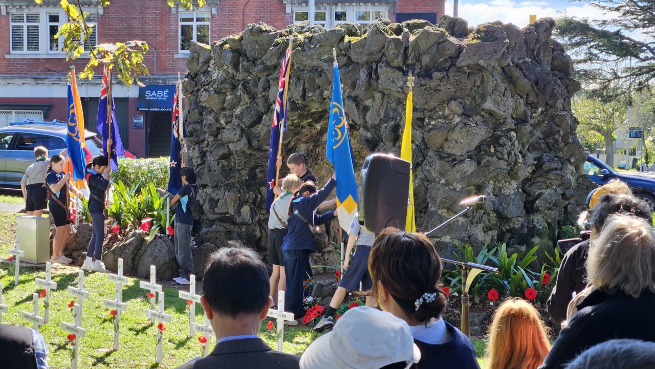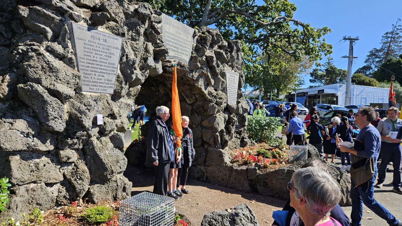 Wonderful turnout this morning on a brilliant day as a good number of the Community, both young and old, gathered for the 45-min 11am Epsom ANZAC Service. Big thanks to Gail Romano: Curator War History Auckland War Memorial Museum who told of two NZ Donald Brown’s (from Otago and Auckland) who both found themselves on the Somme on the morning of 15th Sept 1916. Thanks also the The Reverend Jeremy Woods who delivered yet another thoughtful sermon. Also to Kendyl Smith of the Albert Eden Local Board Auckland Council for leading the Laying of Wreaths. Thanks also to the Epsom District Girl Guides and the St George Scout Group for placing and retreiving the colours.